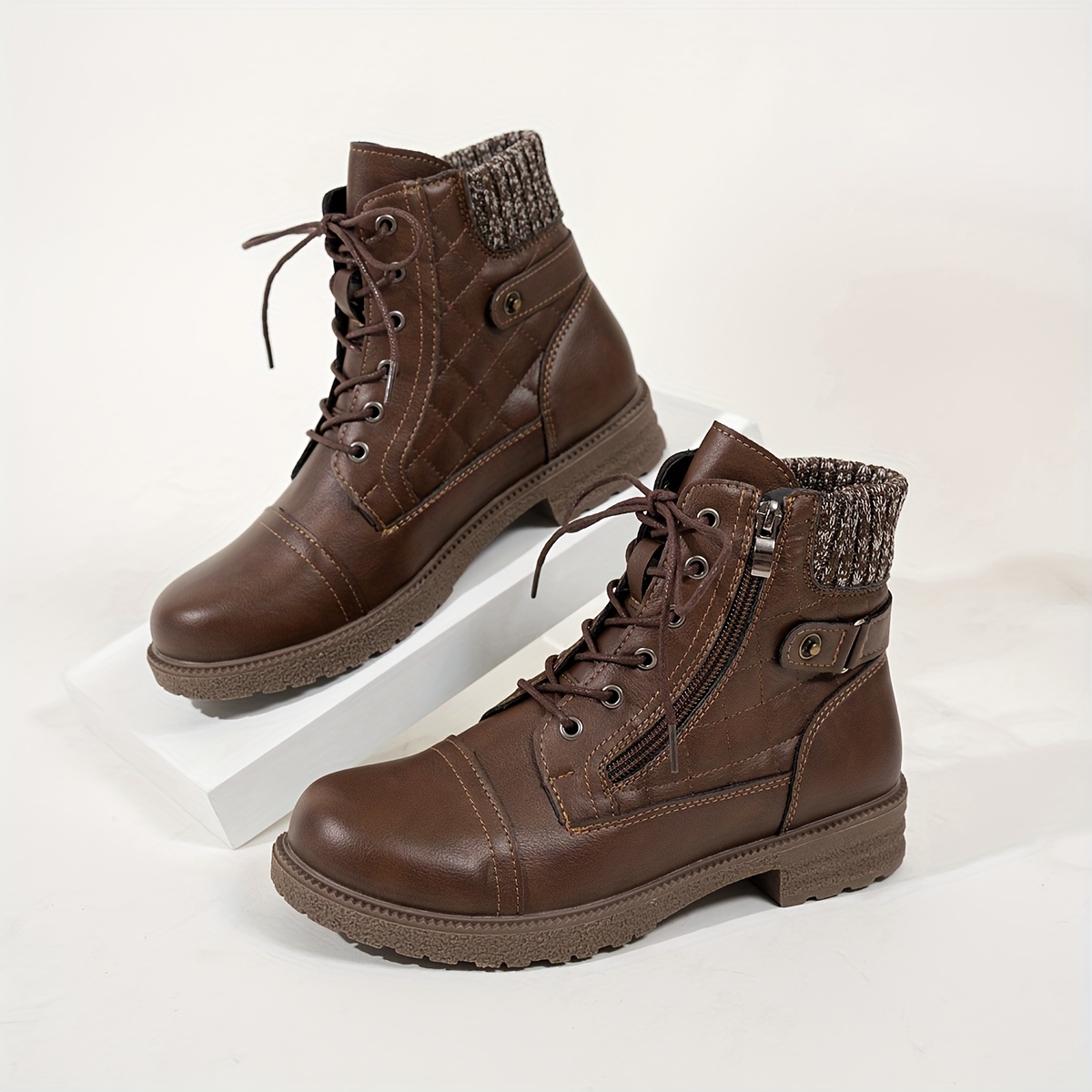 Crafted with a fabric inner lining and insole, these boots provide all-day comfort, while the knitted collar adds a soft, cozy touch. The block mid-heel design offers stability and ease of walking without sacrificing style.