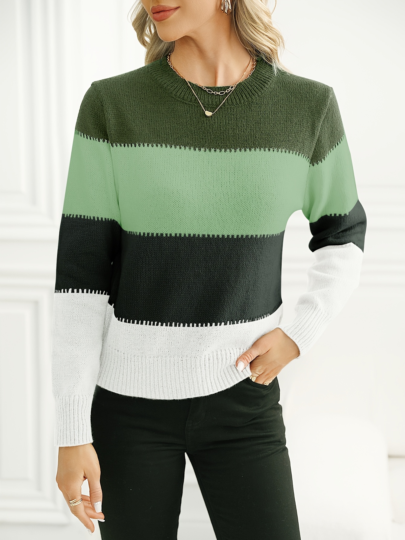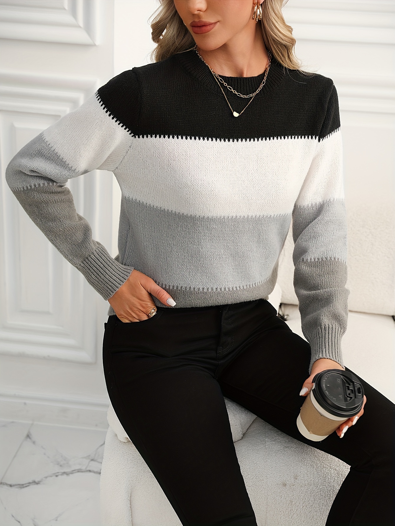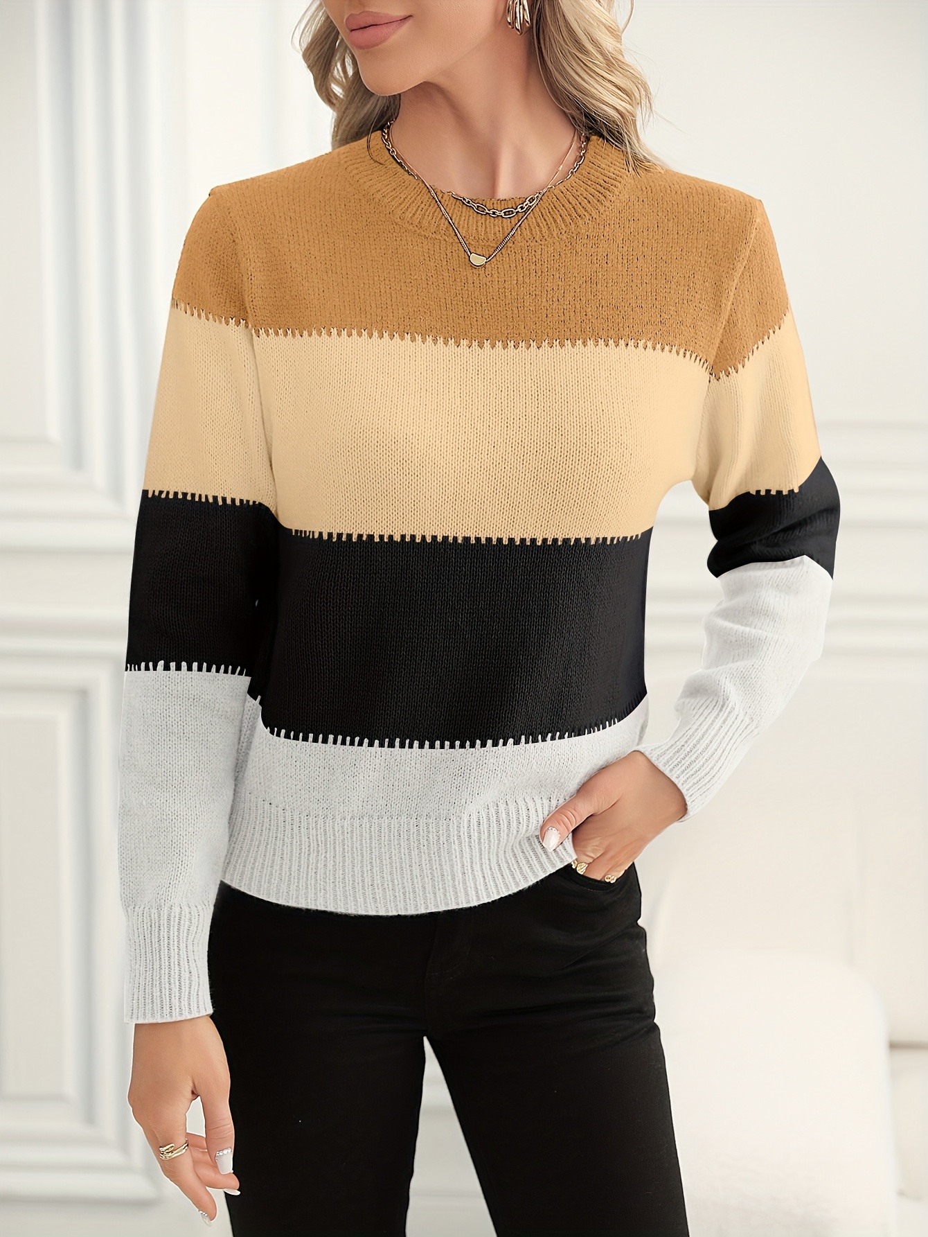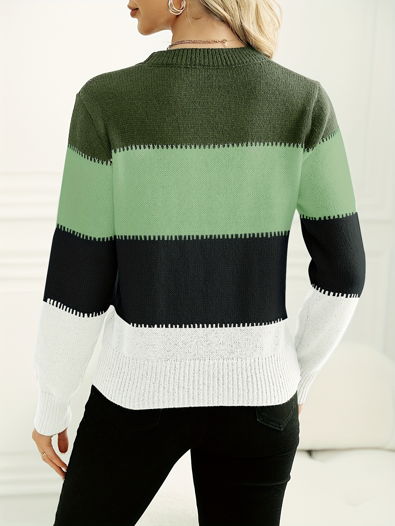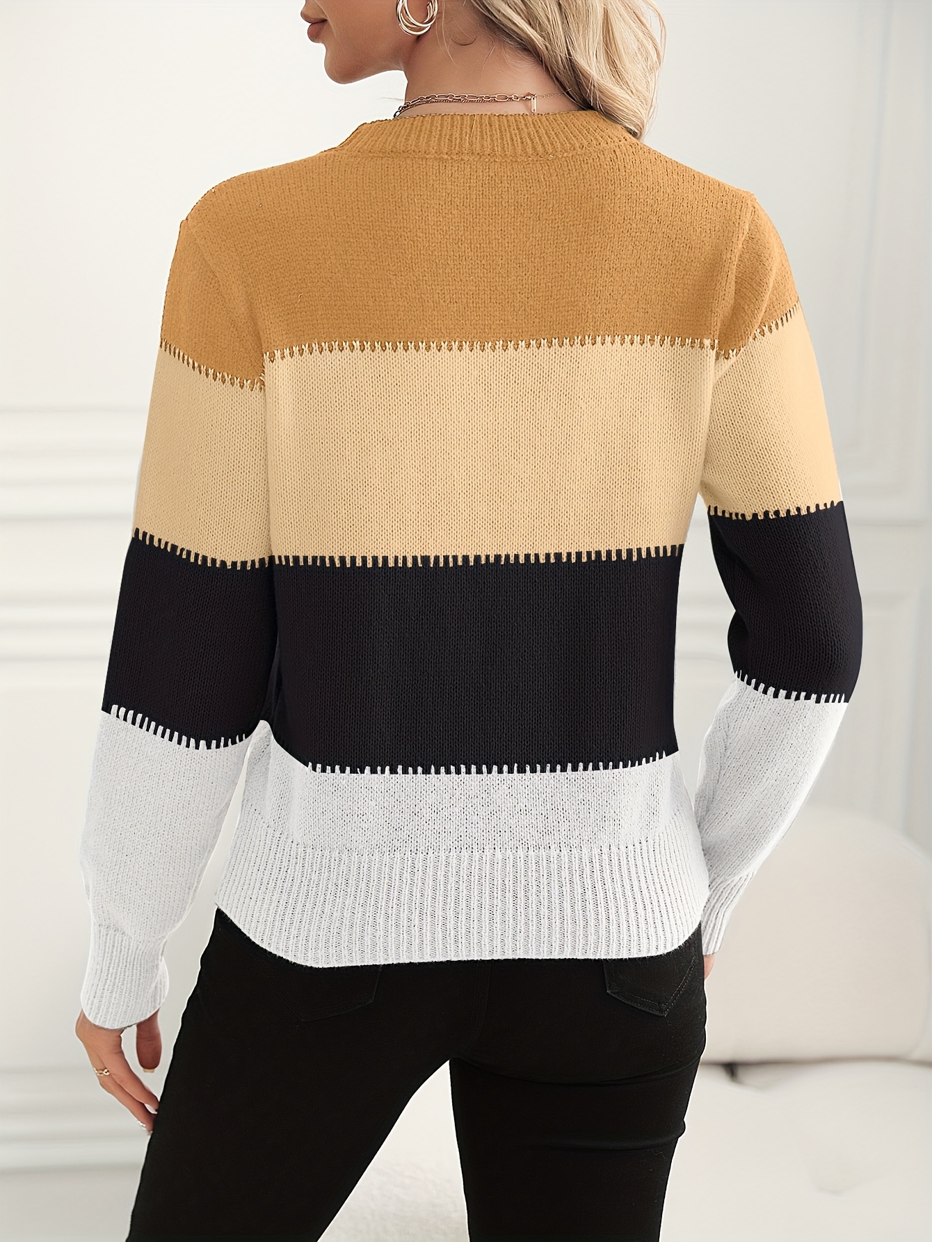 The Color Block Pullover Sweater is a refined and versatile wardrobe essential designed for effortless style during the spring and fall seasons. Featuring a modern patchwork color block design, this knit pullover adds visual interest while maintaining a clean, elegant aesthetic suitable for everyday wear or elevated casual looks.