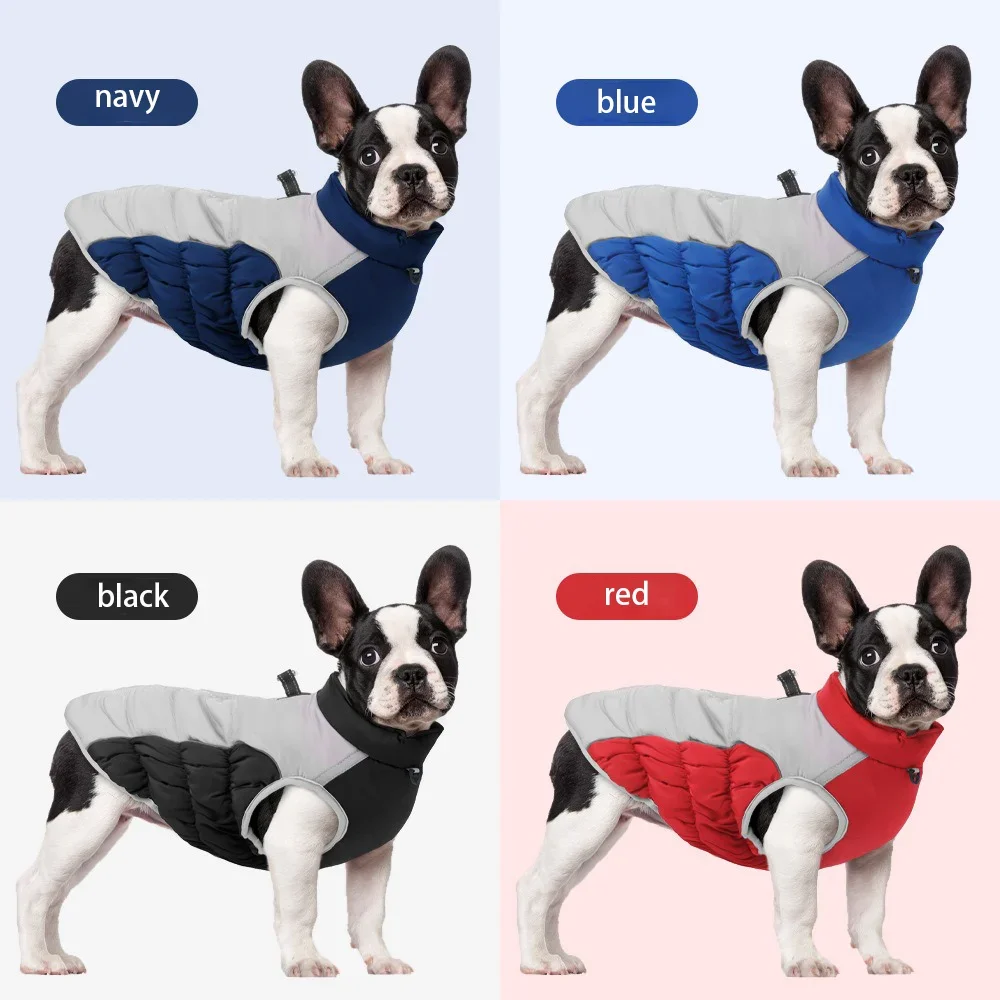 Available in six sizes (XL–6XL) and multiple colors (Navy Blue, Black, Red, Royal Blue), this winter coat fits most large breeds, including Golden Retrievers, Labradors, German Shepherds, Pit Bulls, Dobermans, and French Bulldogs.